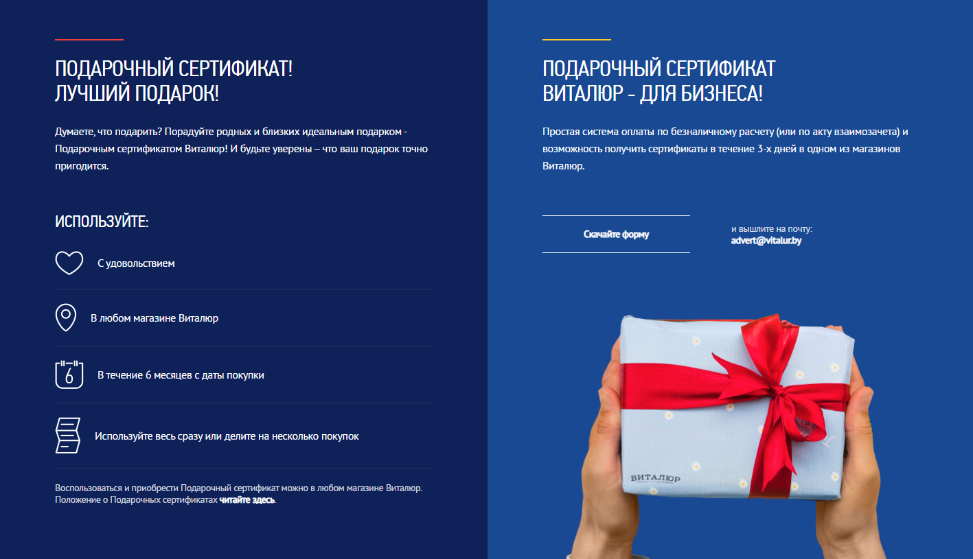 Подарочный сертификат – это отличный способ порадовать родных и близких! Карту принимают все магазины Виталюр. Одариваемый может приобретать любые товары, использовать всю сумму сразу или несколько раз. Срок действия сертификата – 6 месяцев, со дня покупки.