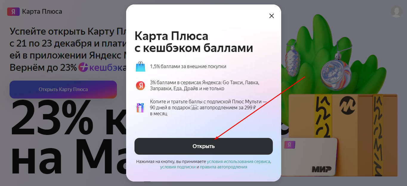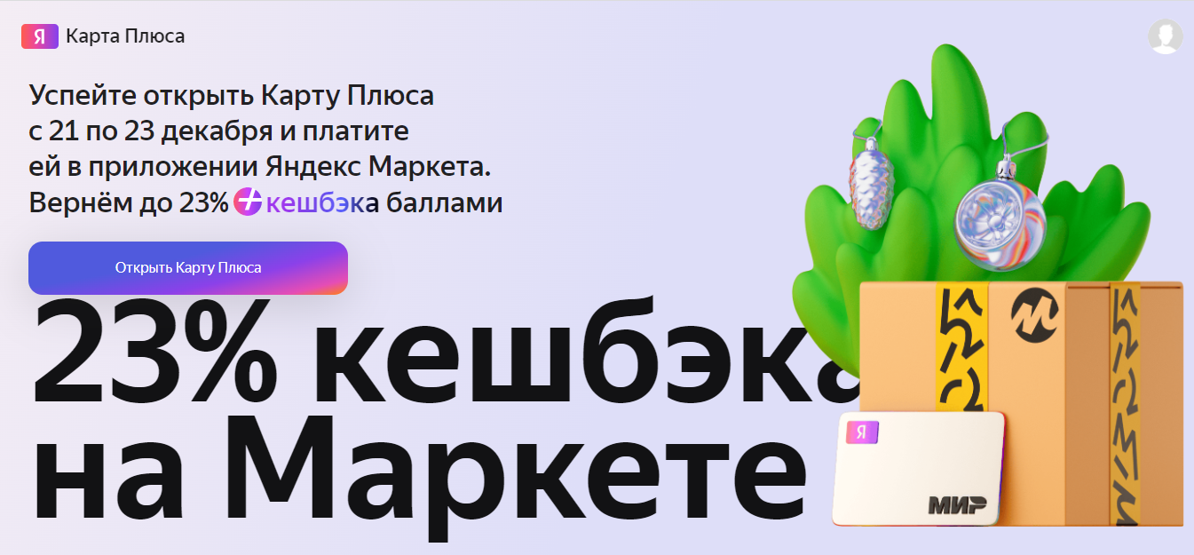 UPD: 21.12.2022 «Яндекс Банк» обещает новичкам кэшбэк в 23% баллами Плюса за покупки по «Карте Плюса» в приложении «Яндекс Маркет» с 21.12.22 по 23.12.22 (открыть карту нужно в этот же промежуток времени).