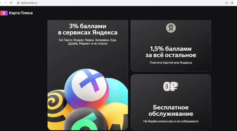 Однако постепенно данный проект свернули, и Яндекс решил развивать собственную «Карту Плюса» на базе «Яндекс Банка» (бывш. банк «Акрополь», приобретенный Яндексом в 2021 году). Насколько успешно, мы и постараемся сегодня выяснить. Вот как выглядит реклама на сайте: